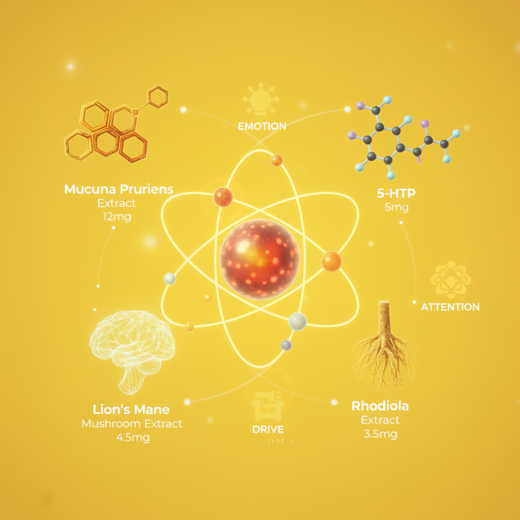 including Mucuna Pruriens Extract, 5-HTP, Lion's Mane, and Rhodiola, these